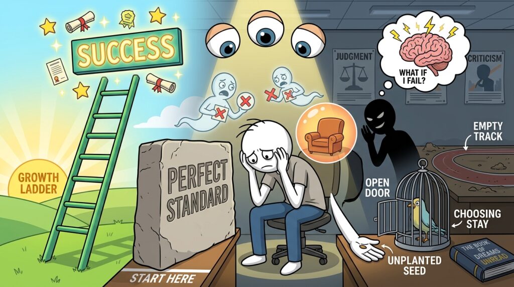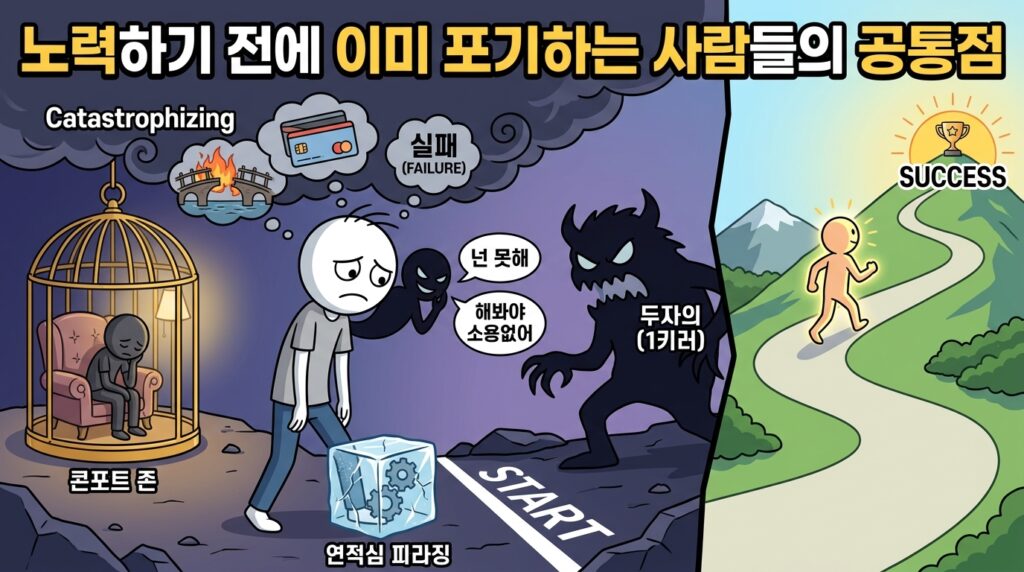 이 사고방식에서는 시도 자체가 큰 위험처럼 느껴집니다. 결과가 좋지 않을 경우 단순한 경험이 아니라 자존감 손상으로 이어질 것이라 예상하기 때문입니다. 그래서 시작하기 전부터 안전한 선택만 하게 되고, 점점 도전 범위가 좁아집니다.