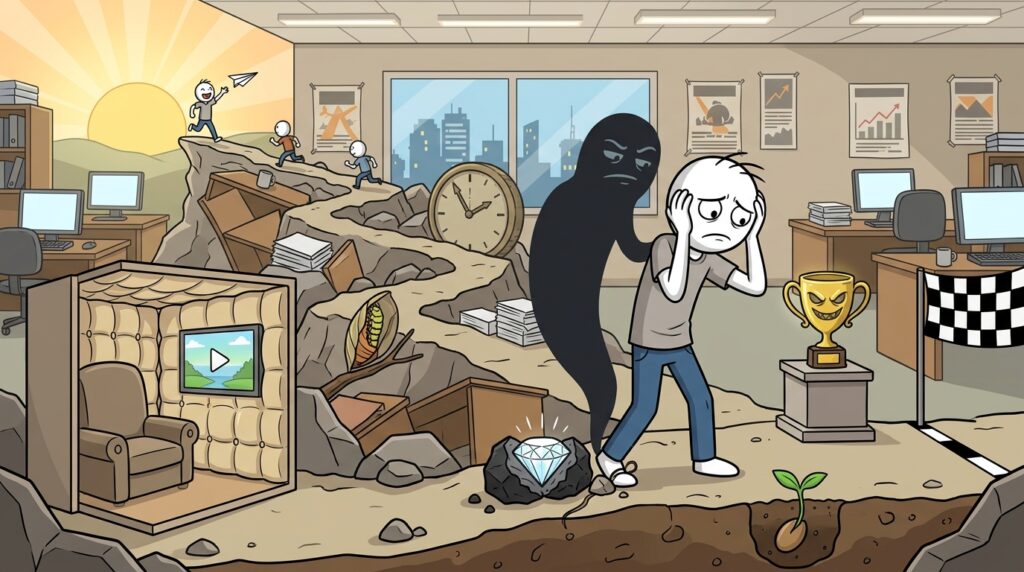 성공 직전에 나타나는 가장 큰 함정은 ‘지금까지의 피로’를 실패 신호로 착각하는 것입니다. 목표에 가까워질수록 난이도는 높아지고, 이전보다 더 많은 집중력이 필요해집니다. 이때 사람들은 힘들어졌다는 이유만으로 방향이 틀렸다고 판단하기 쉽습니다.